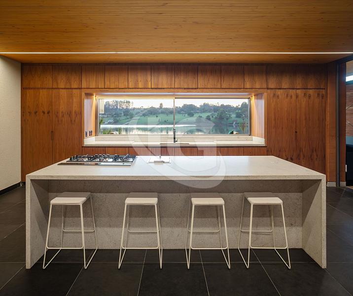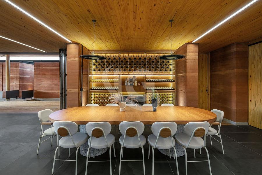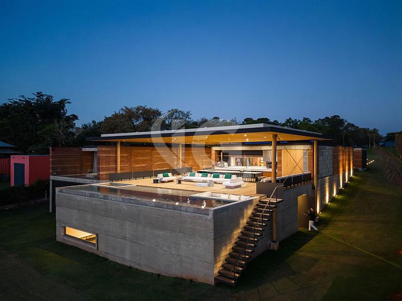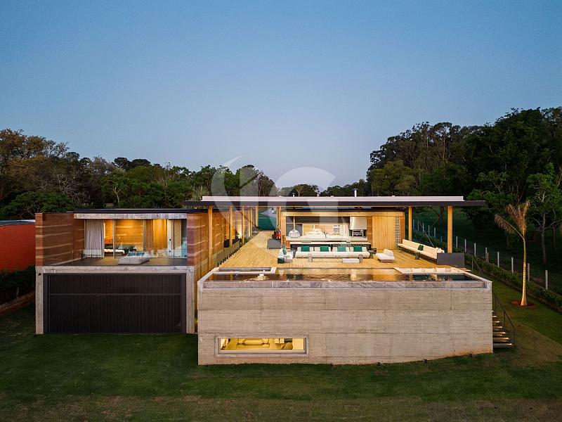 Com um método construtivo inovador, a casa foi erguida utilizando a terra do próprio terreno para formar as paredes de Taipa, um processo que levou cerca de três anos para ser finalizado. A combinação com concreto aparente nas fundações e uma imensa laje em CLT (Cross Laminated Timber – madeira laminada cruzada), com um vão livre de 14 metros, torna esta residência uma das mais únicas do mundo. Os materiais empregados são naturais, como a ardósia preta de exportação no piso e as bancadas de granito levigado, o mesmo material utilizado na piscina, que reflete a água da represa ao entardecer.