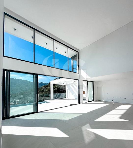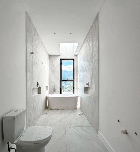 As esquadrias em alumínio da linha Gold e o brise em alumínio com acabamento amadeirado conferem um toque moderno e sofisticado à residência. O guarda-corpo em vidro laminado e temperado proporciona segurança sem comprometer a vista panorâmica. A cobertura impermeabilizada com manta aluminizada garante proteção e durabilidade, e o paisagismo já finalizado completo o cenário perfeito desta residência de alto padrão.